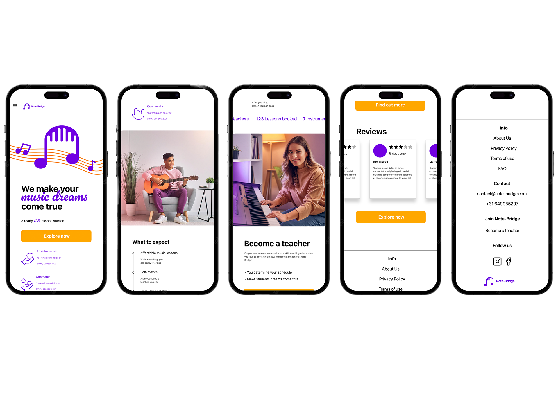 My individual bachelor thesis project was oriented towards the optimization of user experience for an online music school platform that allowed local musicians to teach beginner musicians. The project was for a start-up called Note-Bridge which called the need to first create a brand design guide as there was no prior brand identity for the start-up that could be translated into the design.